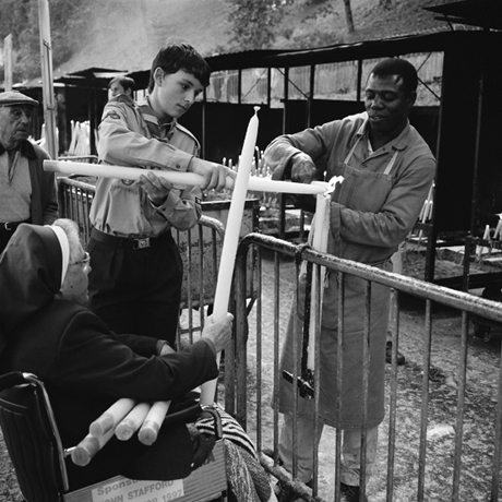 フランス/ルルド 後ろに、願いをかけたロウソクを灯す場所が用意されている